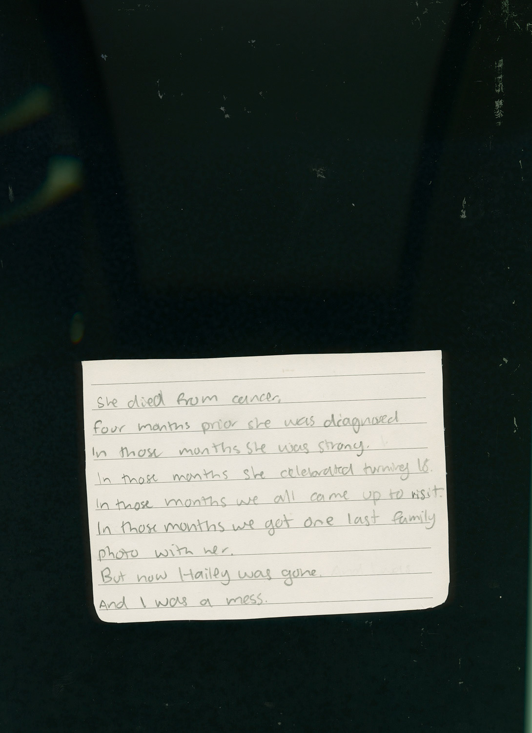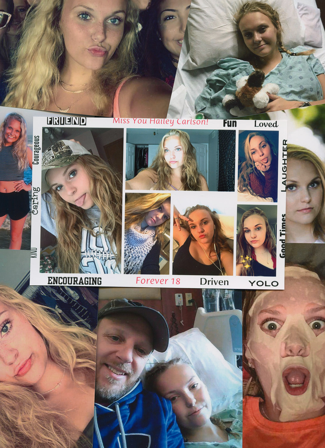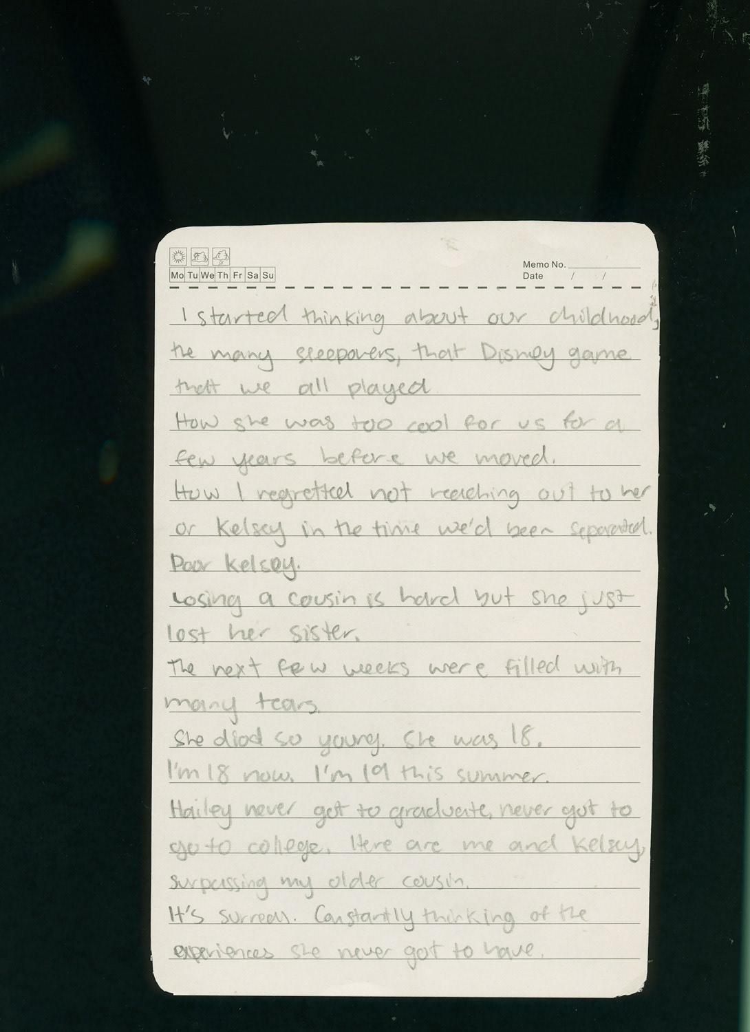 This project is a representation of the grief I felt and still feel about my cousin Hailey's death. It consists of a poem I wrote, a letter from her sister, Kelsey, to her, a couple similarities between us, Kelsey and I's college experiences, and family photos of how different it is without her. The other family photos are reminiscing of our childhood when we lived a few minutes away from each other.