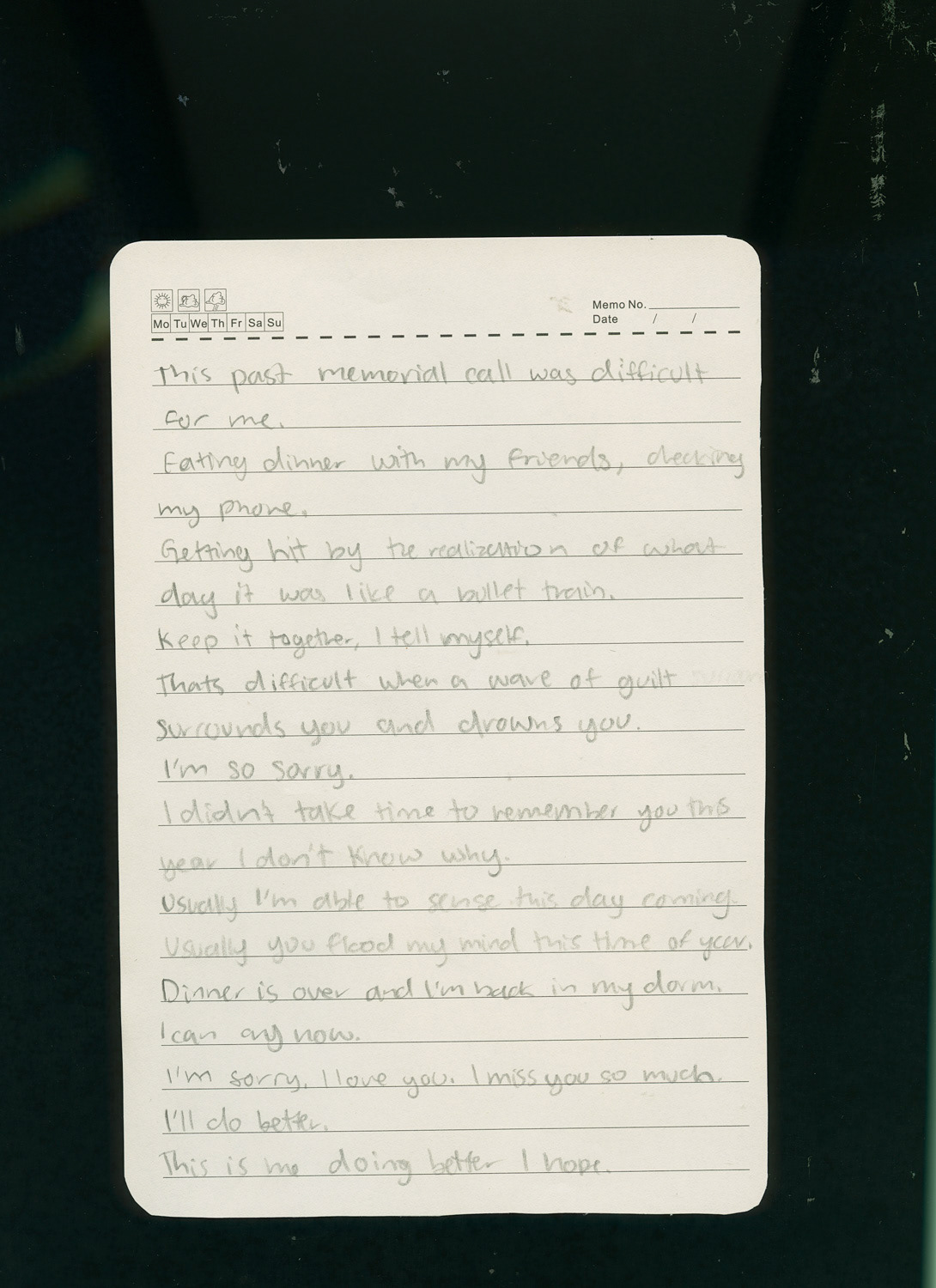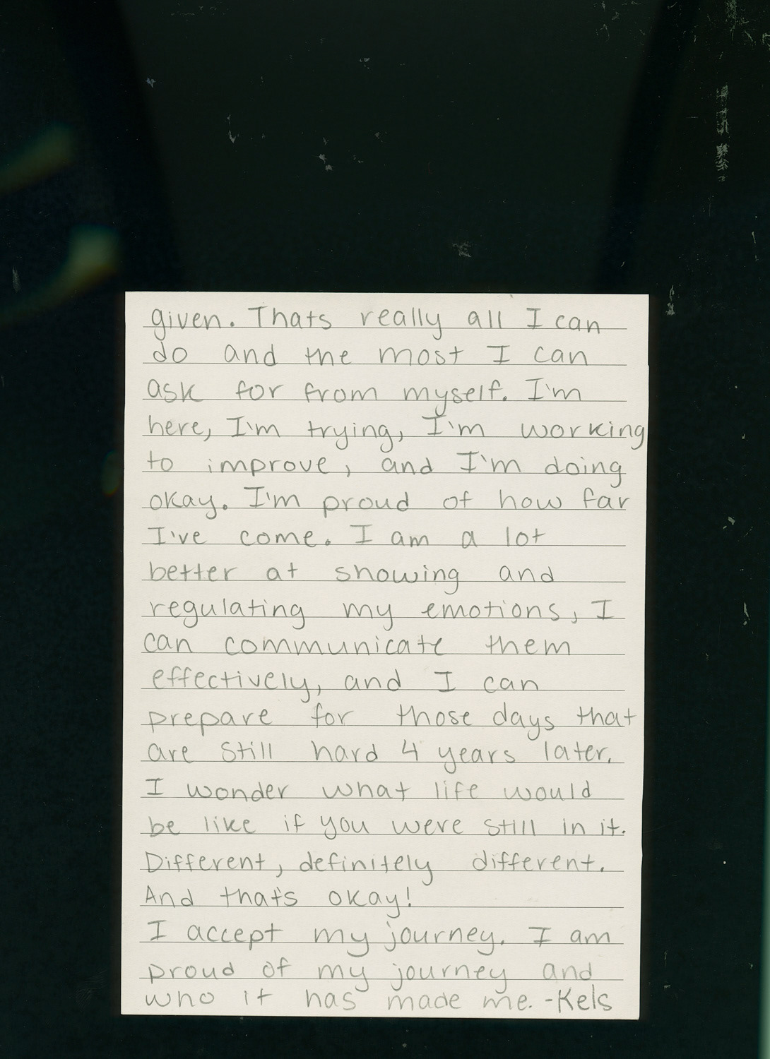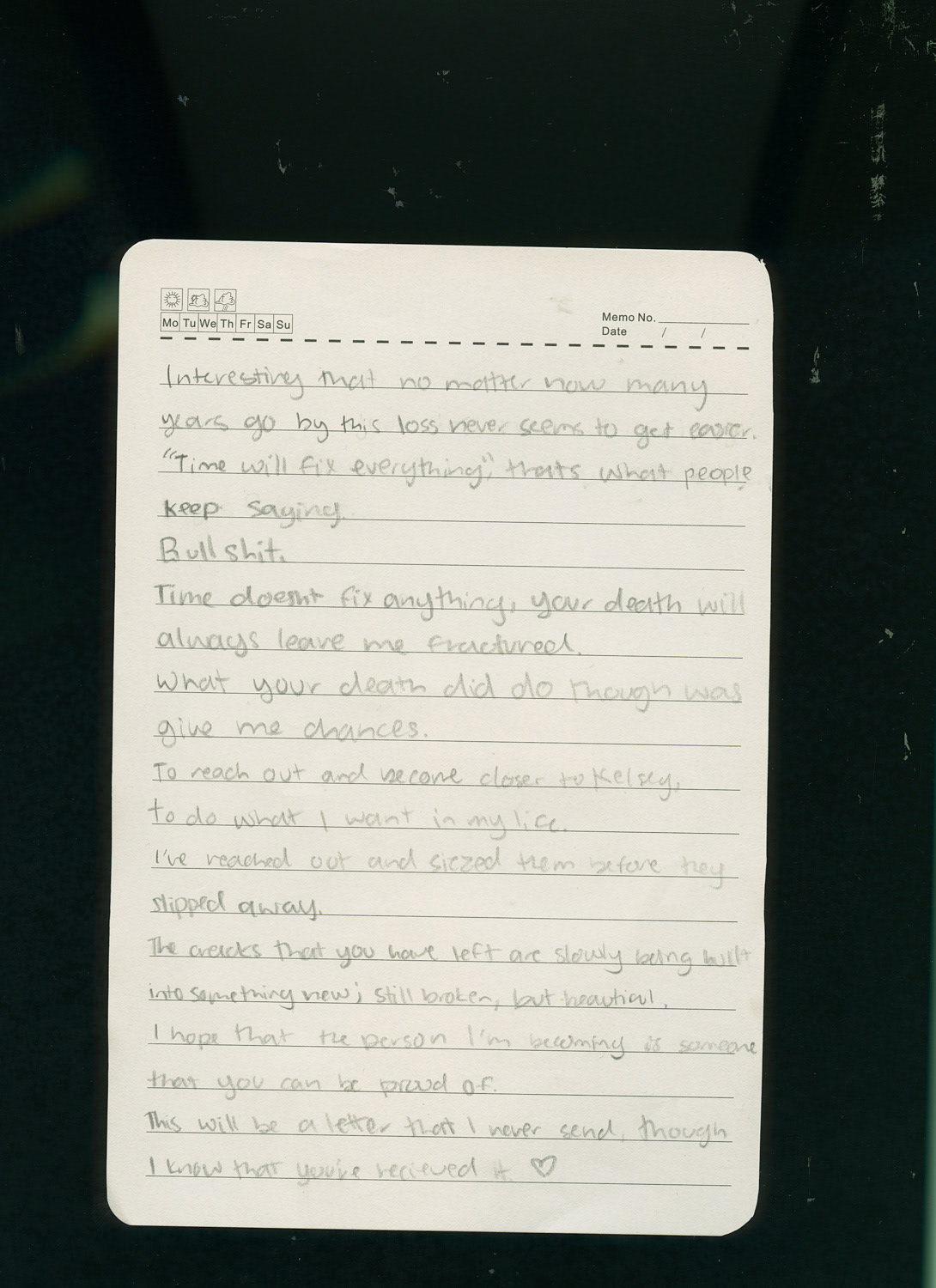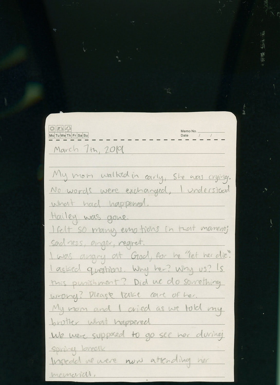 This project is a representation of the grief I felt and still feel about my cousin Hailey's death. It consists of a poem I wrote, a letter from her sister, Kelsey, to her, a couple similarities between us, Kelsey and I's college experiences, and family photos of how different it is without her. The other family photos are reminiscing of our childhood when we lived a few minutes away from each other.